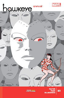 Annuals, for those unaware, tend to be given to popular books at Marvel and are generally a double-size issue that may or may not be pertinent to the story at hand. You don't want to assume that everyone buying the series will buy the annual so you don't want to load it with too much giant stuff but you also want to give everyone a good read and a read that falls within the scope of the book that spawned the annual, especially since annuals tend to be more expensive. This one is 4.99 instead of Hawkeye's typical 2.99 (I believe it's still one of the 2.99 books; it might be 3.99 and I'm too far away to look at old issues right now. Well I could. But I won't. Could I look it up on the internet? Yup. But we're really already taking too much time from the review). With that in mind, you should buy this book despite its cost and its possibility to be skipped (I'm not sure it is really possible to be skipped at this point but I think you could gain just about everything you need to gain for the future out of past issues and future issues. Hard to say as I, too, am not in the future). This annual focuses on Kate Bishop, the Lady Hawkguy, the Hawkeye, the Young Avenger, and so on, and her travel westward. She's done with Clint and his desire to push everyone away when he needs them most and she refuses to be dragged down by him. With Lucky in tow, she drives out to California, happy to get away for at least a little bit and desperate to figure out who she wants to be in this world. However, she's not the only person interested in her identity (perfect segue); Madame Masque, who Kate royally pissed off back in Hawkeyes 4 and 5, has had her ear to the ground all this time, waiting for Katie Kate to resurface. Now Kate has to get away from a solid Marvel villain as well as the people she actually cares about, though frankly Madame Masque is the more threatening in that situation.